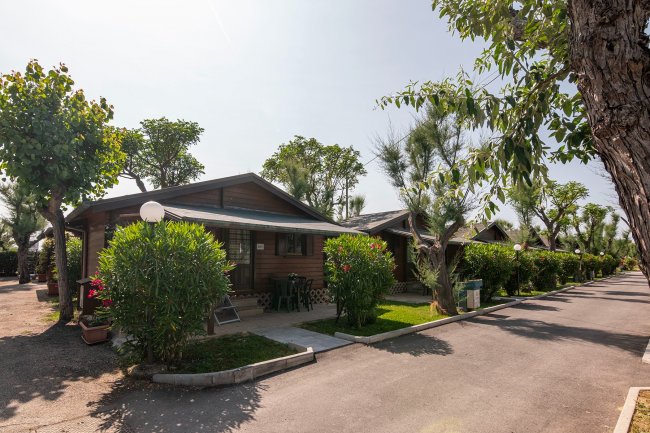 Bungalow in legno lungo un viale alberato.