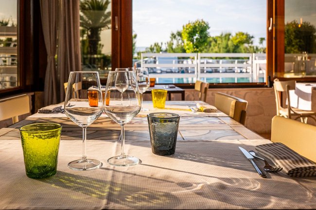 Tavolo apparecchiato con bicchieri, vista sul terrazzo.