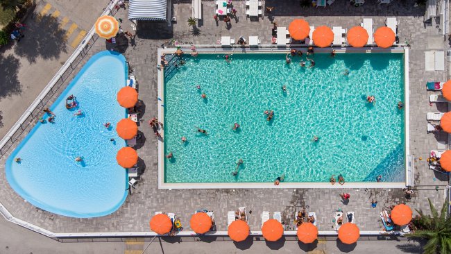 Vista aerea di due piscine con ombrelloni arancioni.