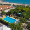 Vista aerea di un campeggio con piscina vicino alla spiaggia.