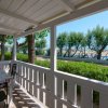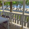 Veranda coperta con tavolo e sedie, vista su alberi e mare.