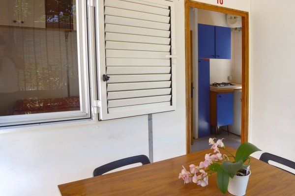 con aria condizionata, 4/5 posti letto, angolo cottura, bagno, doccia con acqua calda, veranda esterna attrezzata e posto auto ombreggiato