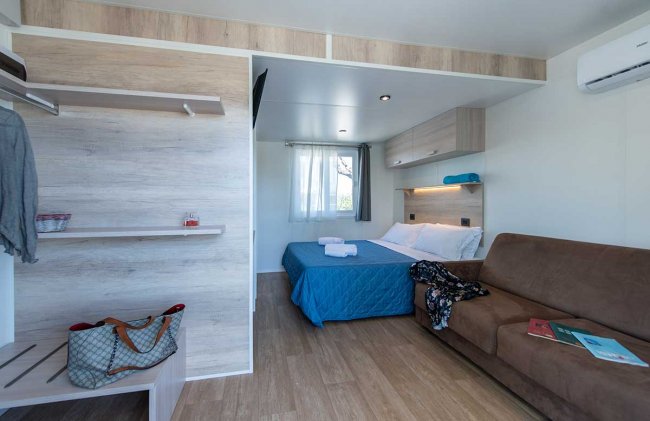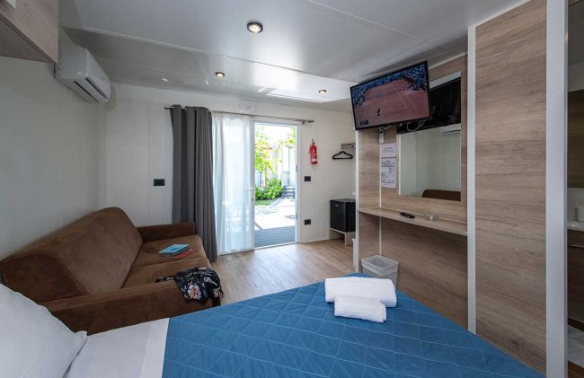 Trilocale di 24 o 32 mq con soggiorno con angolo cottura, camera matrimoniale,camera con letto signolo e uno a castello, aria condizionata, tv, bagno completo di tutti i servizi, area esterna.