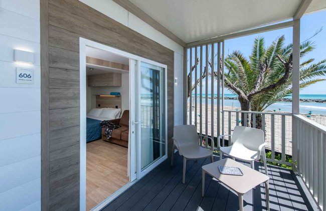 Veranda di un bungalow con vista mare.