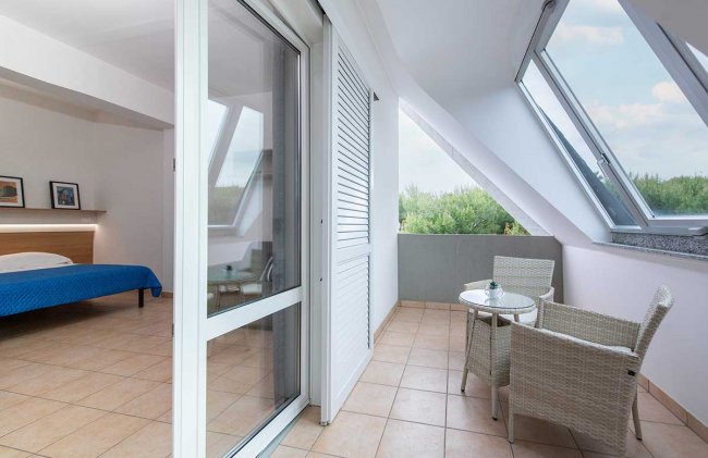 Camera con terrazza e poltroncine bianche.