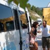 Una donna scende da un furgone bianco mentre un uomo le offre una mano.