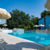 Piscina all'aperto con ombrelloni e lettini bianchi, circondata da alberi e un edificio blu.