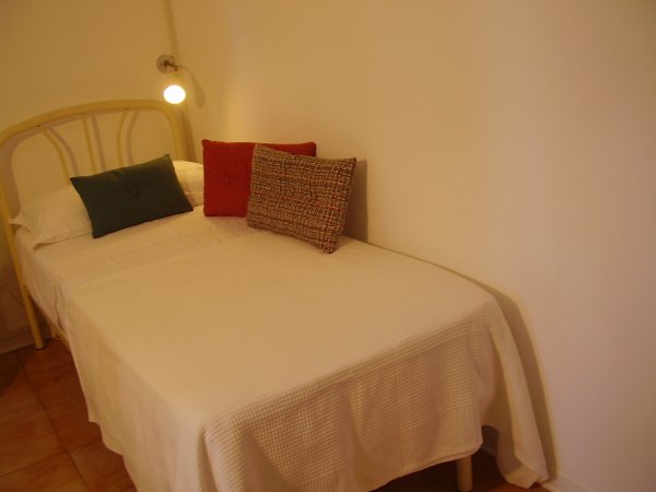 Letto singolo con tre cuscini colorati su copriletto bianco, sotto una luce.