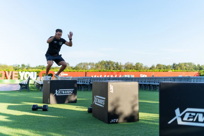 Persona che esegue esercizi di salto su scatole in un campo all'aperto.