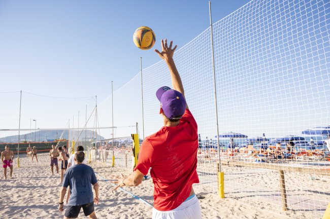 Un uomo gioca a beach volley sulla spiaggia, alza la palla per un attacco.